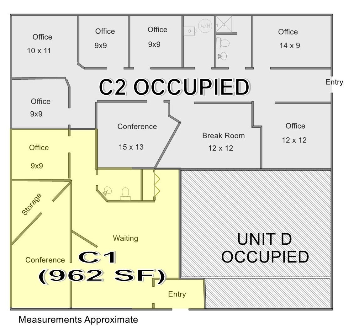 Suite C1: 962 SF office space with reception, open clerical, (1) private office, conference room (or 2nd private office) and bath. $16 psf Full Service Gross. $1,282.66/mo. (utilities included). Ample parking and monument signage.