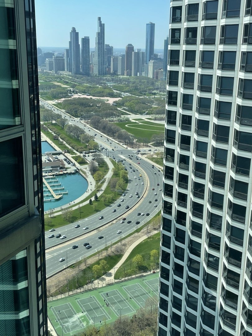 Enjoy spectacular sunrise & sunset views of the lake, city, Navy Pier, and park from this high floor 2 bedroom, 2 bathroom + den condo at the prestigious ParkShore. The ParkShore amenities include a rooftop outdoor pool with a sun deck & hot tub, a health club, tennis courts, two hospitality rooms, outdoor grills, 24 hour door staff, on-site management, & dry cleaner. The unit features floor to ceiling bay windows, a Bosch washer & dryer, primary bedroom suite with a walk-in closet and full bath, a den/office that can easily be converted to a third bedroom, a second bedroom with ample closet space and easy access to the hall bath, a rare self-park parking space (#93), & a storage locker (#4) located on level P1. The ParkShore is a pet friendly building. It is a short pedway walk to Bockwinkel's grocery. Located near Millenium Park, Near East Side park, Riverwalk, Mariano's Grocery, Michigan Avenue, Maggie Daly Park, the lakefront, area restaurants, & public transportation giving you easy access to the Loop!