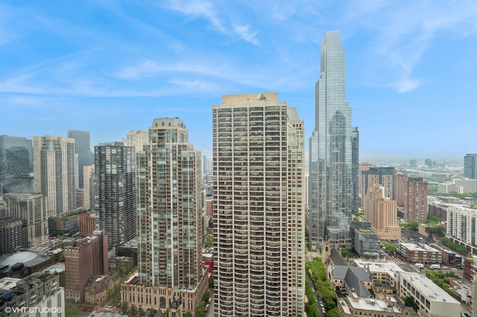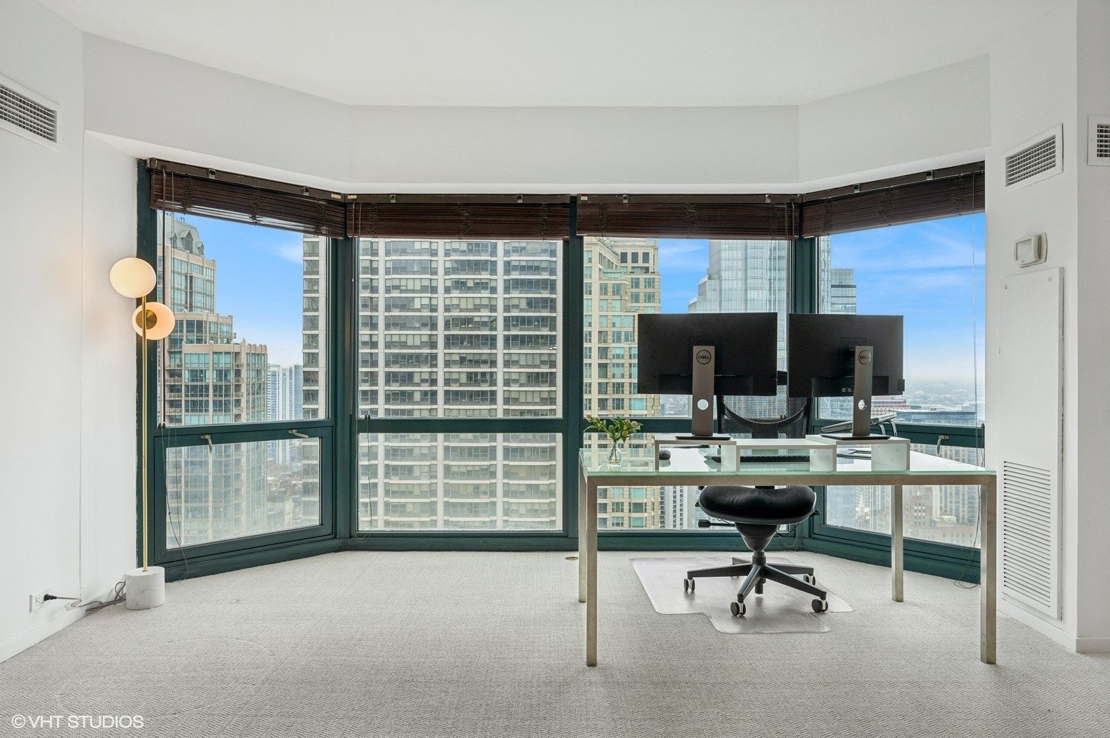 Welcome to the Huron at 100 East. This 3 bedroom, 2 1/2 bath unit in a full amenity River North building will take your breath away. The huge living and dining room space features floor to ceiling windows with western city views offering tons of natural light and ample space to spread out. Updated kitchen with white cabinets, new quartz counter tops, updated hardware and plumbing fixtures, induction cooktop, and updated appliances. The kitchen opens right into the 3rd bedroom/ office area via French doors which allows tons of natural light into the kitchen. There's an updated powder room off the living area/ kitchen with new vanity, toilet, lighting, and more. Down the hall you will find a full bath and second bedroom with brand new carpet, followed by a large primary suite with multiple closets and bathroom with separate soaking tub and walk-in shower. Unit has many updates including appliances, carpet in 2 of the bedrooms, plumbing fixtures, and lighting throughout the unit. Multiple walk in closets and a large laundry room with full sized washer and dryer. Full amenity building with 24 hour door staff, on-site manager, almost $4M in reserves, newer roof (2023), brand new gym, sun deck with grills, party rooms, steam rooms, sauna, and a lap pool. Manager on site and many other recent building updates. Live right on the corner of Michigan Ave in the heart of vibrant downtown Chicago! Rentals allowed with a 2 year lease, pet friendly, and currently about 90% owner occupied. Valet or reserved parking is available starting at around $292/ month. Fully electric building!
