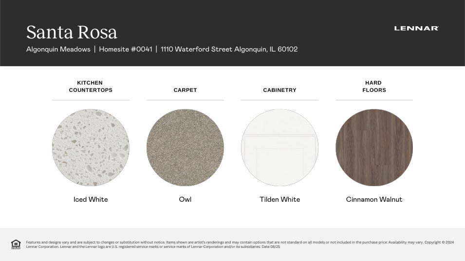 SPECIAL FINANCING OFFERS AVAILABLE!! READY FOR JANUARY DELIVERY!! Homesite# 0041 Welcome to the Santa Rosa plan -a stylish two story layout offers four spacious bedrooms, two full bathrooms, and a convenient powder room on the main floor. The heart of the home centers around an open concept flow: the kitchen, breakfast area, and family room merge seamlessly, while a formal dining area off the foyer provides an inviting space for meals and gatherings. At the back of the first floor, you'll find a versatile flex room, ideal for a home office, playroom, or quiet retreat-perfectly tailored to your lifestyle. Upstairs, a charming loft space graces the top of the stairs, offering additional living flexibility. The luxurious owner's suite features dual walk in closets and a spa inspired en suite bathroom. Three more bedrooms share access to a well-appointed full bathroom. The second-floor laundry adds ease to daily routines. A three car garage and thoughtful interior design details enhance both function and style throughout-making the Santa Rosa a smart and livable choice for modern family life. Exterior will be Slate color vinyl siding with Old World Ledge - Grey Quartzite exterior stone color. (pic for reference ONLY) *Photos are not this actual home* The homesite is located near a beautiful pond. Nestled in a beautifully planned community, Algonquin Meadows offers a variety of thoughtfully designed single-family homes, traditional townhomes, and urban townhomes - all set among serene green spaces and tranquil ponds. Winding streets, cul-de-sacs, and walking paths create a peaceful neighborhood atmosphere that feels private, yet perfectly connected. Just minutes away, charming downtown Algonquin awaits with scenic riverfront parks, fishing spots, and a vibrant local culture. You'll enjoy convenient access to premier destinations like Northwestern Medicine, top-rated golf courses, and fitness centers such as Lifetime Fitness. Located right off the Randall Road corridor, you're surrounded by some of the area's best shopping and dining - including Trader Joe's, Cooper's Hawk, Target, Costco, and Algonquin Commons. Whether you're looking for daily essentials or a relaxing night out, everything you need is within easy reach. Come home to Algonquin Meadows - where natural beauty, community charm, and modern convenience meet.