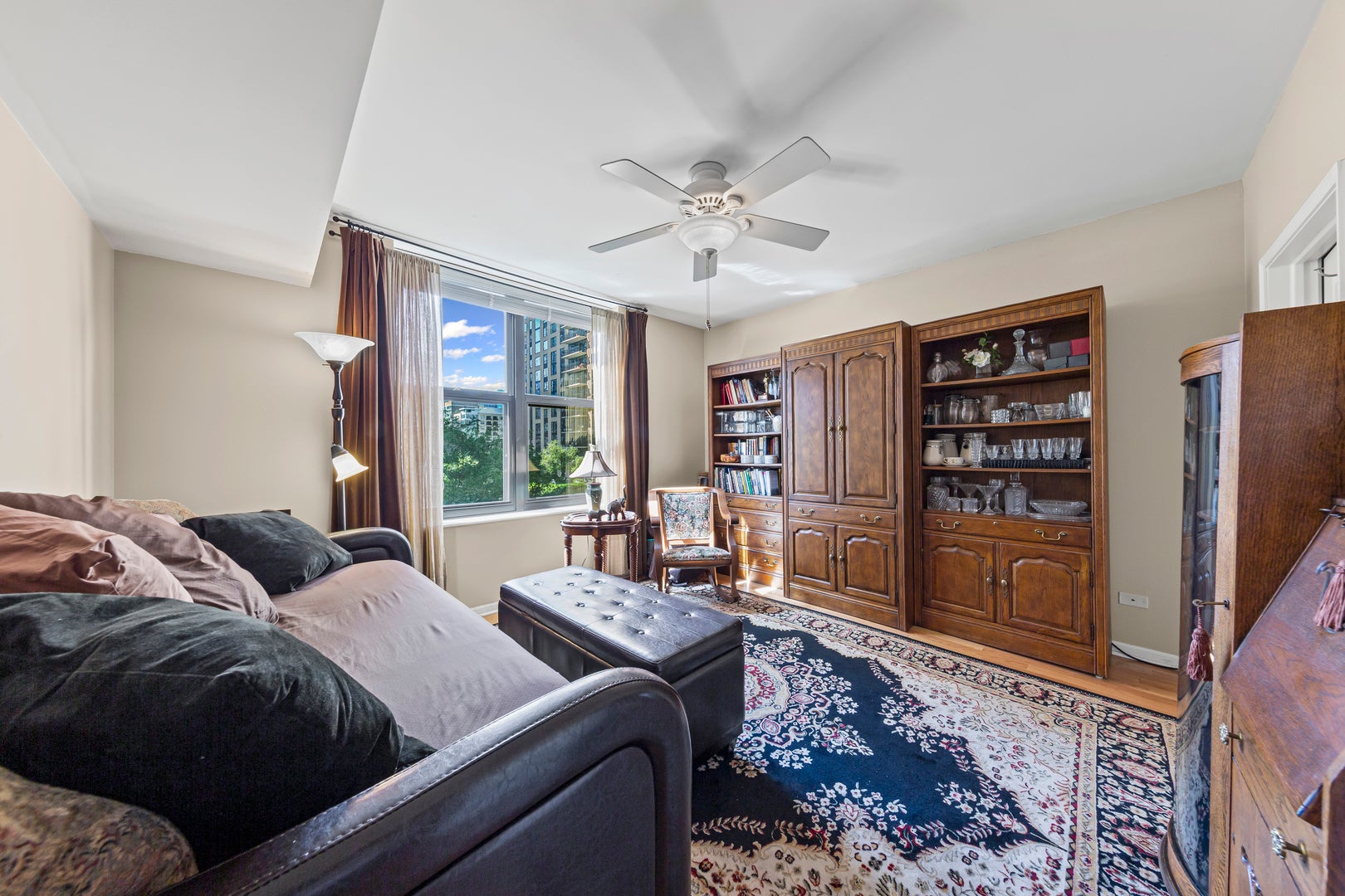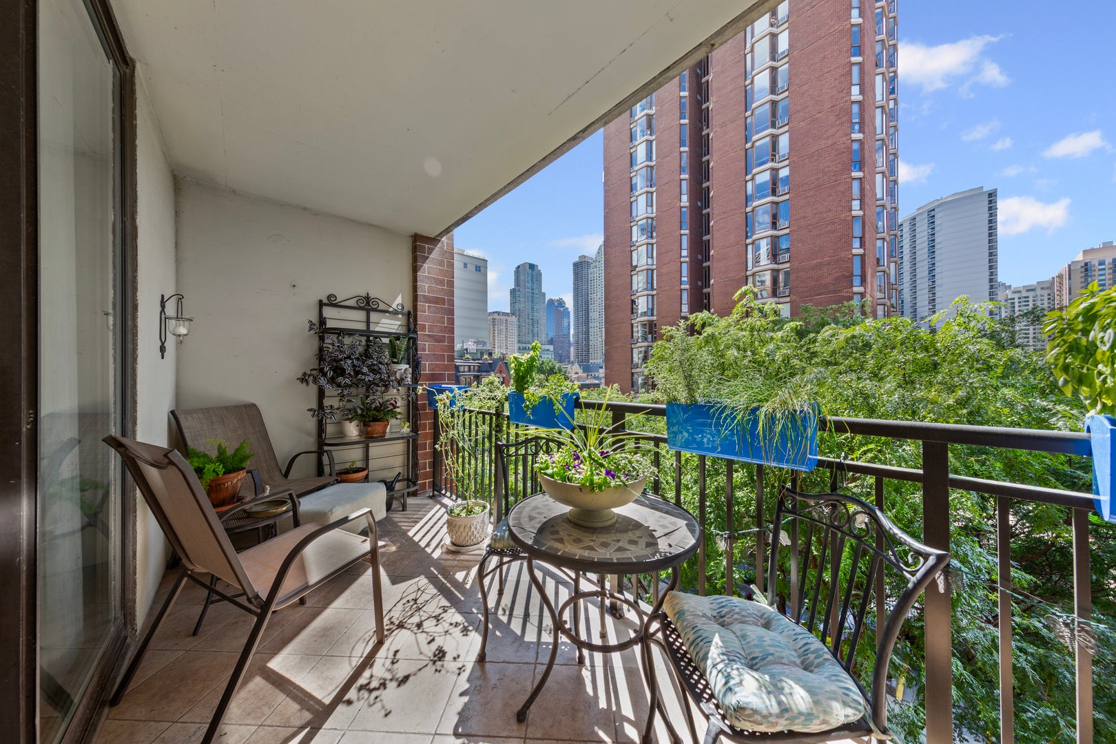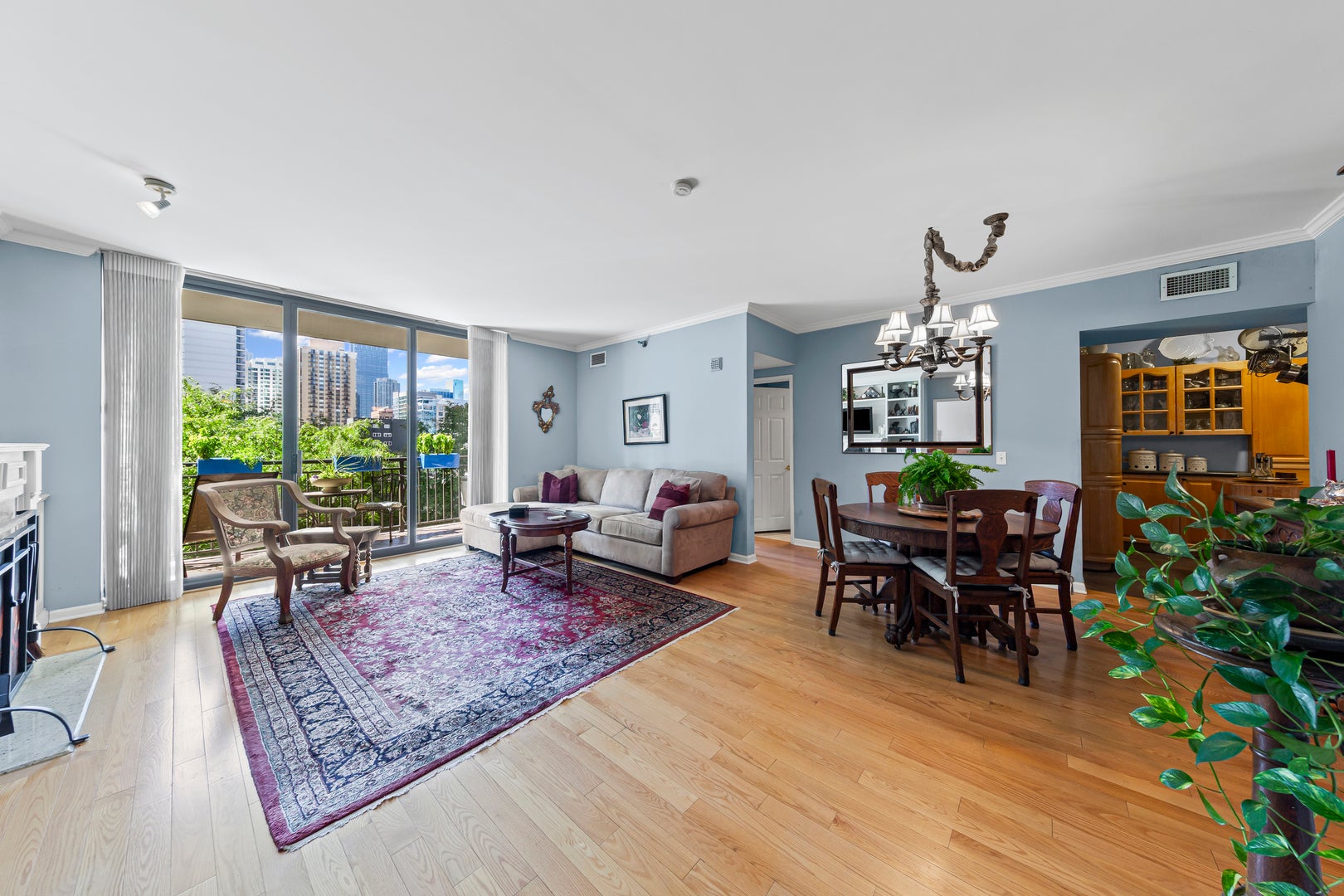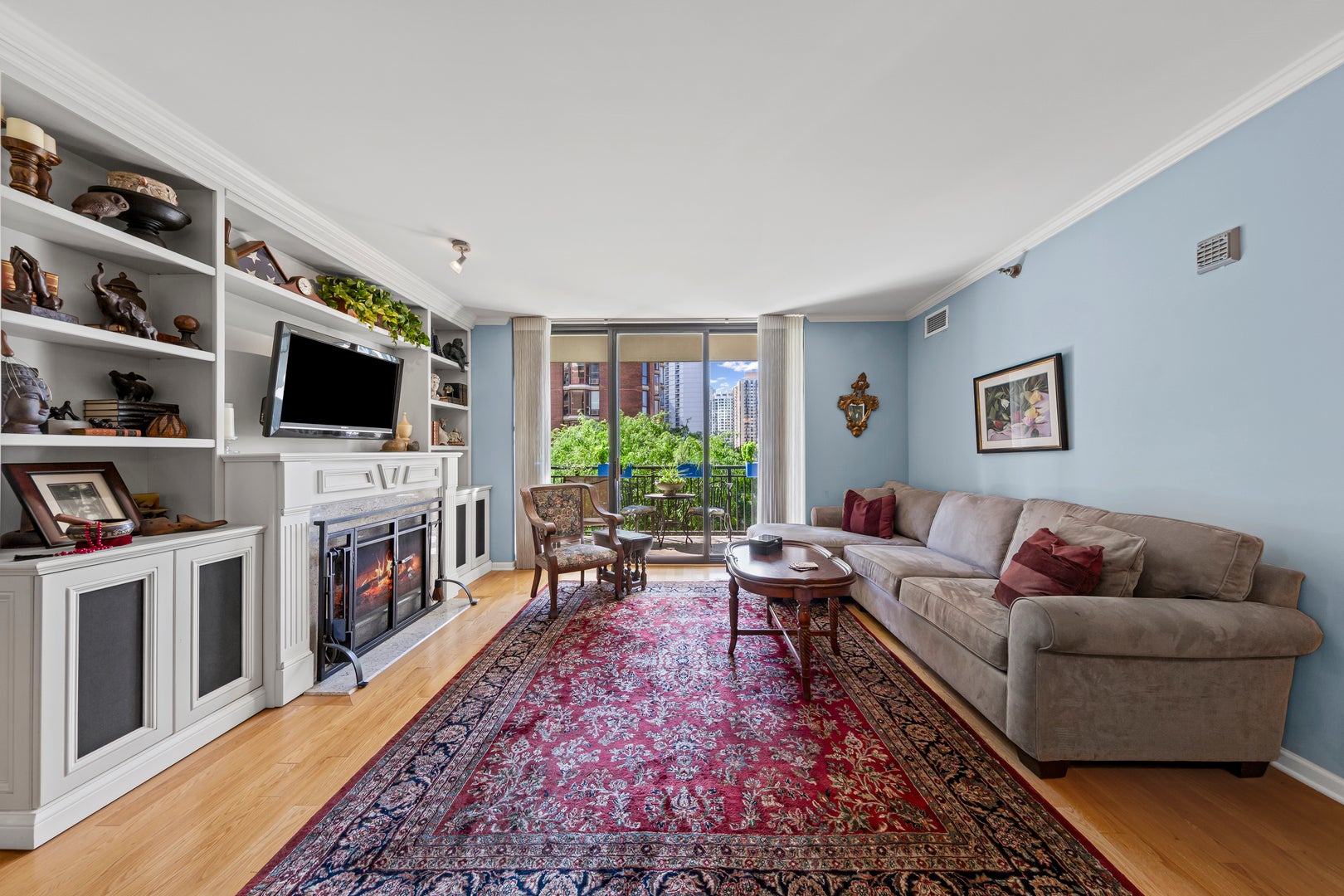 Welcome to the prestigious full amenity Park Newbury, a luxury condominium complex by the renowned Loewenberg & Associates overlooking Washington Square Park and the historic Newbury Library. The building exterior exudes opulence and grace with the center fountain and professionally landscaped gardens. Enter through the recently renovated lobby and be greeted by the professional, 5 star 24-hr door staff (truly the friendliest door staff in the city!) Head up the elevators to unit #608, one of the largest 2 bedroom floor plans in the building with skyline and treetop views for miles. An expansive chef's kitchen, appointed with warm honey-toned wood cabinetry and sleek granite countertops (PLUS an under counter wine fridge) opens seamlessly to the dining and family rooms-both accented with gleaming hardwood floors and extending out to a remarkable 18-foot balcony. Curl up on the couch in front of the fireplace in the coming cold months while gazing out over the balcony to the city beyond. Just off the kitchen, a versatile bonus room offers endless possibilities - currently designed as a chef's prep area with additional custom cabinetry and ample counter space, it could easily serve as a third bedroom, private home office, or charming breakfast nook (in addition to the full dining room). The thoughtful split floor plan enhances privacy, ensuring no shared walls between the two bedrooms. The primary is adorned with two extra large walk in closets, a large set of windows overlooking the skyline, and a huge primary bathroom with separate shower and double sinks. The large second bedroom is also outfitted with a large, built out walk in closet and is positioned right next to the guest bath for convenience. Deeded prime parking spot #16 is included with the price. This well planned building has 5 elevator banks, a larger than life state of the art fitness center, a renovated party room, business center, two sundecks, a receiving room, and an onsite dry cleaners. Private MASSIVE 80 sq. ft. storage room with a steel door included in the price. The Park Newbury is dog friendly, has onsite management, and an onsite engineer. Walk to the Mag Mile, Oak Street Beach, and all of the shops and restaurants you could imagine. Please exclude the butcher block counter in the current breakfast nook.