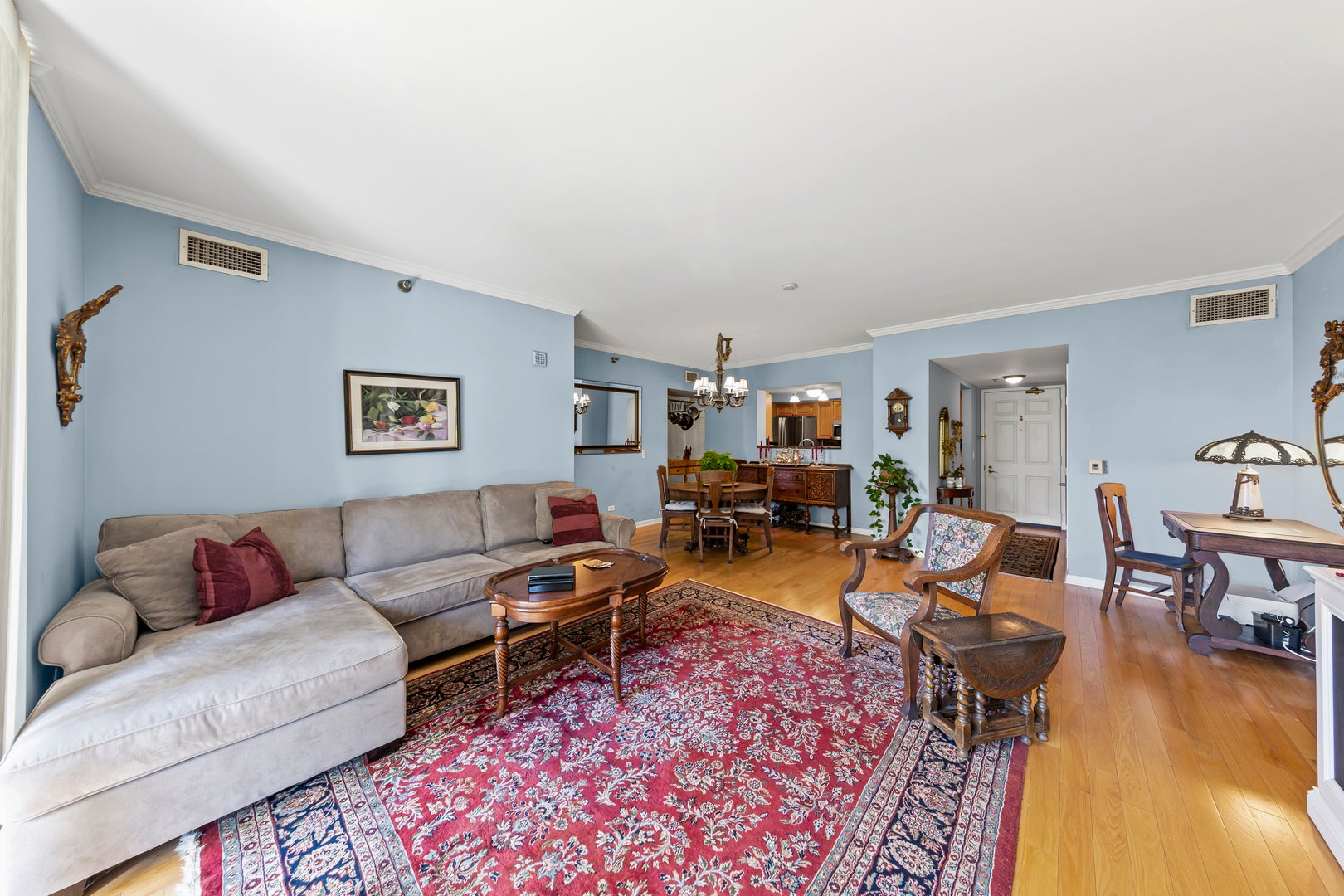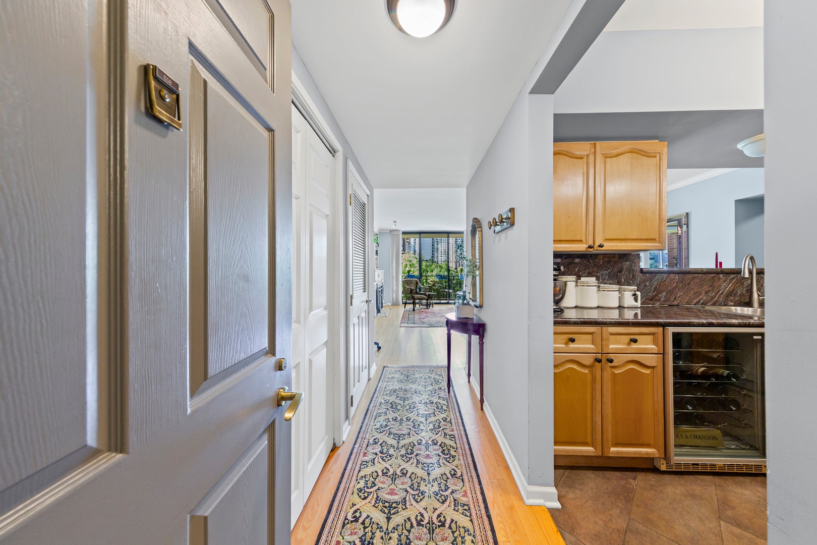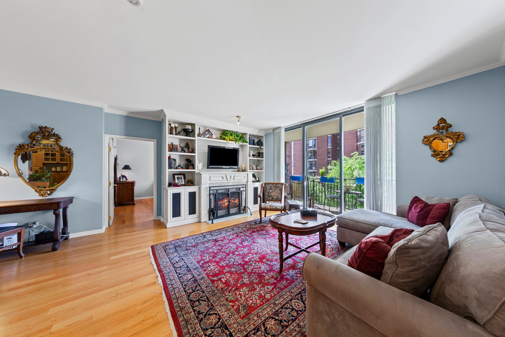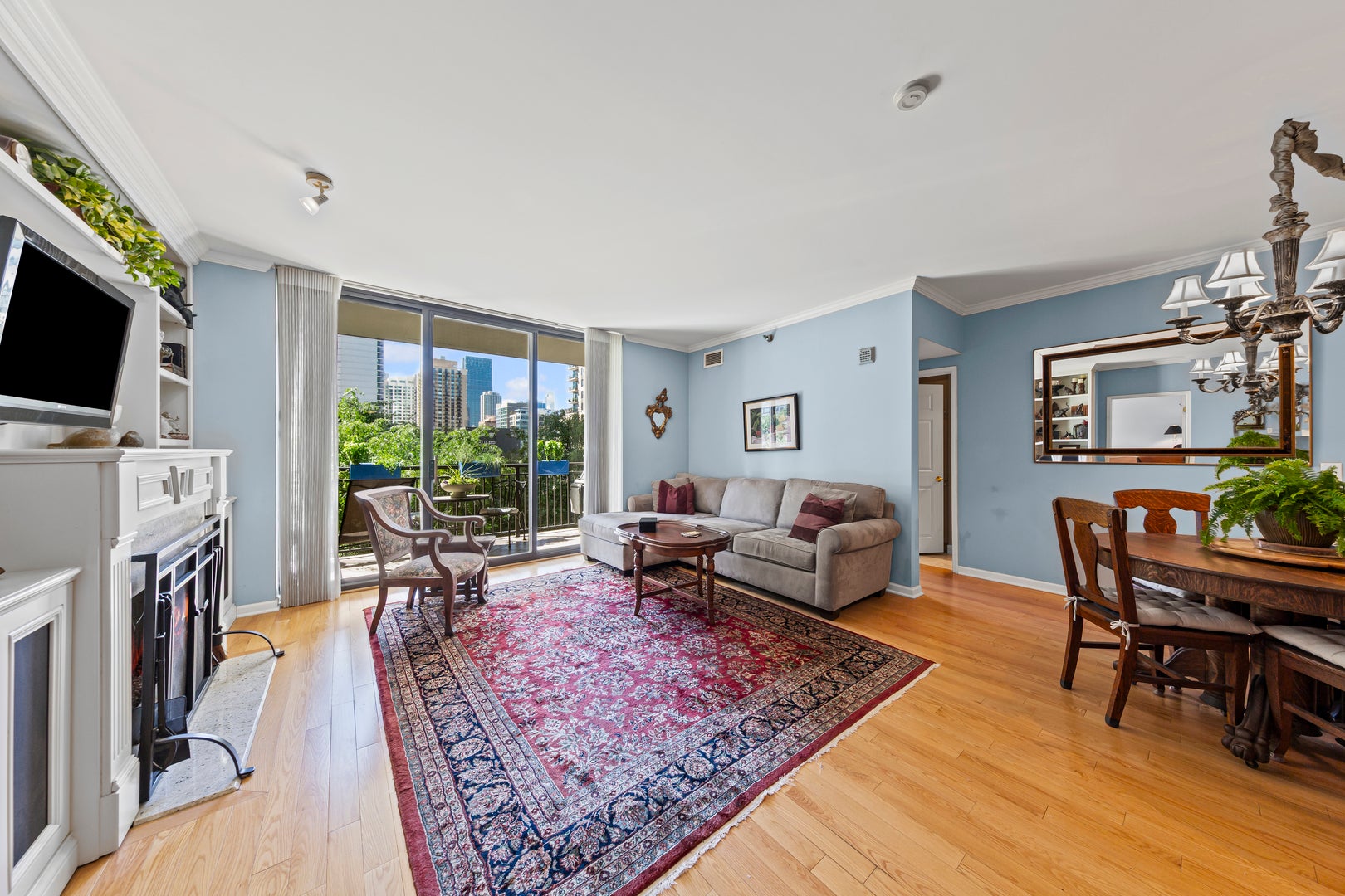 Welcome to the prestigious full amenity Park Newbury, a luxury condominium complex by the renowned Loewenberg & Associates overlooking Washington Square Park and the historic Newbury Library. The building exterior exudes opulence and grace with the center fountain and professionally landscaped gardens. Enter through the recently renovated lobby and be greeted by the professional, 5 star 24-hr door staff (truly the friendliest door staff in the city!) Head up the elevators to unit #608, one of the largest 2 bedroom floor plans in the building with skyline and treetop views for miles. An expansive chef's kitchen, appointed with warm honey-toned wood cabinetry and sleek granite countertops (PLUS an under counter wine fridge) opens seamlessly to the dining and family rooms-both accented with gleaming hardwood floors and extending out to a remarkable 18-foot balcony. Curl up on the couch in front of the fireplace in the coming cold months while gazing out over the balcony to the city beyond. Just off the kitchen, a versatile bonus room offers endless possibilities - currently designed as a chef's prep area with additional custom cabinetry and ample counter space, it could easily serve as a third bedroom, private home office, or charming breakfast nook (in addition to the full dining room). The thoughtful split floor plan enhances privacy, ensuring no shared walls between the two bedrooms. The primary is adorned with two extra large walk in closets, a large set of windows overlooking the skyline, and a huge primary bathroom with separate shower and double sinks. The large second bedroom is also outfitted with a large, built out walk in closet and is positioned right next to the guest bath for convenience. Deeded prime parking spot #16 is included with the price. This well planned building has 5 elevator banks, a larger than life state of the art fitness center, a renovated party room, business center, two sundecks, a receiving room, and an onsite dry cleaners. Private MASSIVE 80 sq. ft. storage room with a steel door included in the price. The Park Newbury is dog friendly, has onsite management, and an onsite engineer. Walk to the Mag Mile, Oak Street Beach, and all of the shops and restaurants you could imagine. Please exclude the butcher block counter in the current breakfast nook.