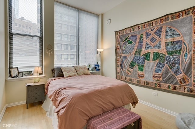 Loop/Theater District large 1400 sq ft 2 bedroom 2 bath unit, enjoy volumes of natural light with the 12 FT ceilings. This is a beautiful updated condo with hardwood floors throughout and in unit washer/dryer. Kitchen features granite countertops & stainless steel appliances, cherry cabinets. The master suite has 4 closets and a private full bath. The 2nd bedroom is lofted and works great as either a bedroom or a den. The building features 24 hour door person, workout room, 7th floor business center with free internet station - fax/copier/scanner, roof deck with grills, onsite manager and maintenance. Great central Loop location! Steps to Millennium Park, Art Institute, the Lake, red & blue EL lines.