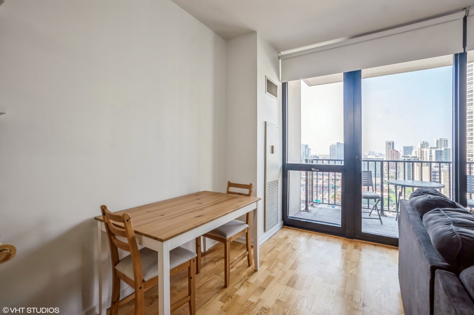 Welcome to The Edge Lofts at 210 S Des Plaines St Unit 2103, a bright and spacious studio condo offering stunning city views! This well-designed unit features an open layout with floor-to-ceiling windows, bringing in abundant natural light throughout the day. The large space easily fits a king-sized bed, living space, and dining or work space. Enjoy the convenience of in-unit laundry, a private balcony perfect for relaxing or entertaining, and a modern kitchen equipped with stainless steel appliances. This full-amenity building includes a fitness center, a community room for residents, and a 24/7 doorstaff. The location is unbeatable - just minutes to Union Station, the Medical District, West Loop, Greek Town, top universities, and surrounded by countless dining, shopping, and entertainment options. Don't miss this fantastic opportunity to live in the heart of the city with everything you need right at your doorstep! Deeded heated garage parking in a convenient spot available for purchase!