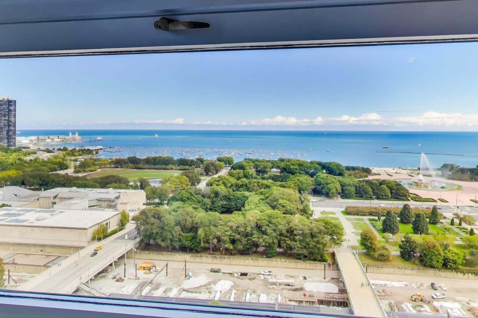 Forever views overlooking Buckingham Fountain, Grant Park & the Lakefront from every room! 6 picturesque windows capture the views of Grant park, and lake. Spacious entry with elegant gallery hall opens up to the living rooms and TV ares. Updated kitchen cabinets, tons of cabinets room, and counter space for prepping. Preferred split floor with generous primary bedroom, both bedrooms offer large windows with tons of natural light. Both bedrooms provide an en-suite bathroom and with a .5 in the common area. Large walk-in W.D room with an very new W.D 24 hour door staff, fitness center, and additional LARGE storage on the same floor. (6/3/3). 1 heated garage space available for $35k addl. (#14)