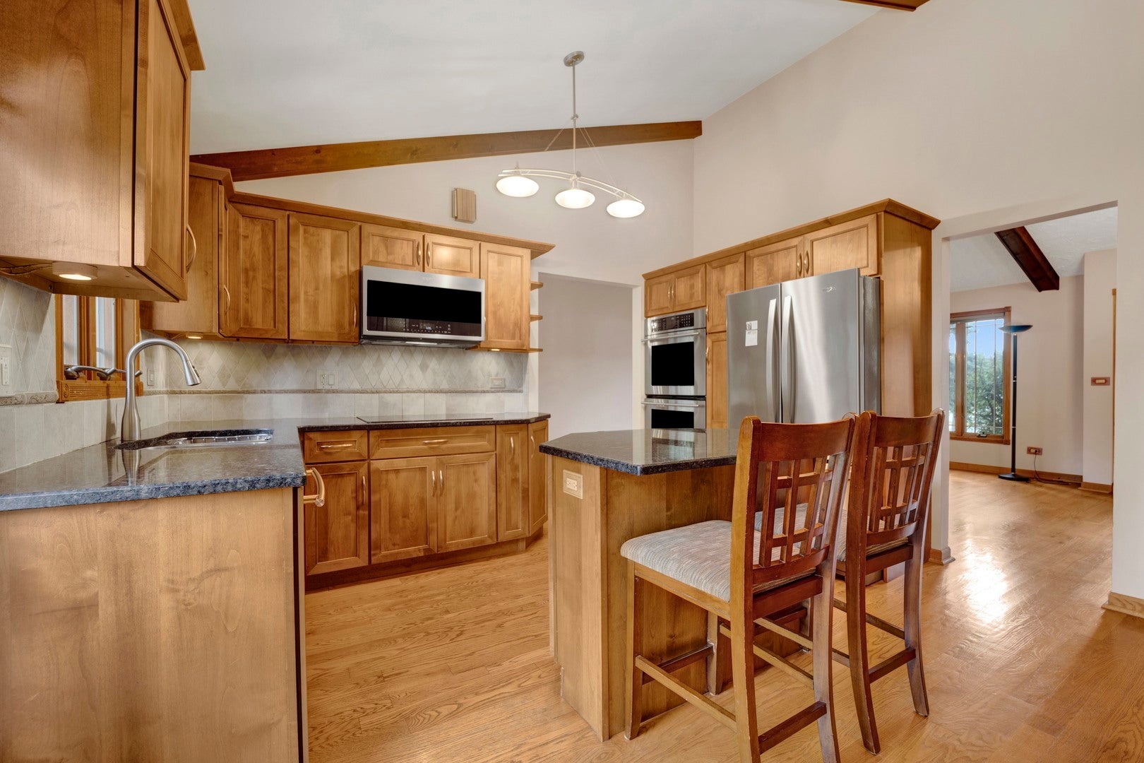 - Interior FeaturesVaulted Ceiling(s), Beamed Ceilings, Granite Counters, Separate Dining Room